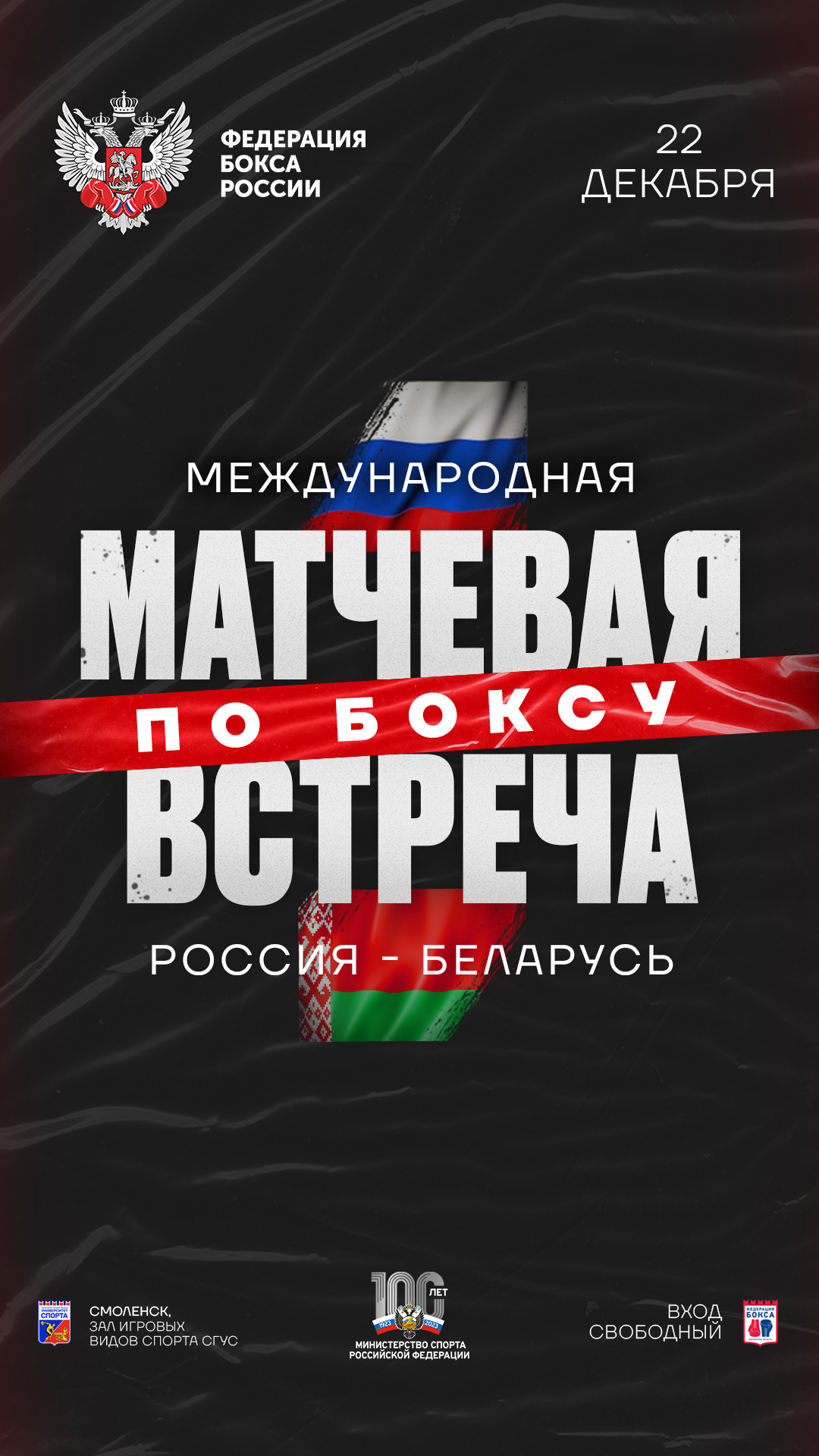 22 декабря 2023 года в Смоленске состоится матчевая встреча по боксу среди команд России и Республики Беларусь, посвящённая 1160-летию города, а также развитию дружественных отношений между странами. Турнир пройдёт в зале игровых видов спорта Смоленского государственного университета спорта.