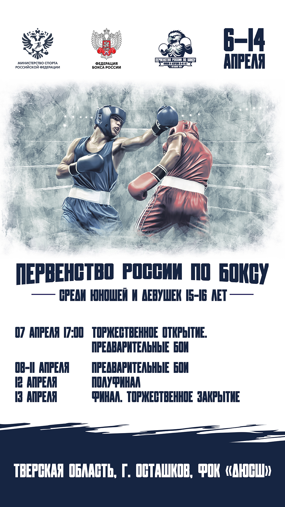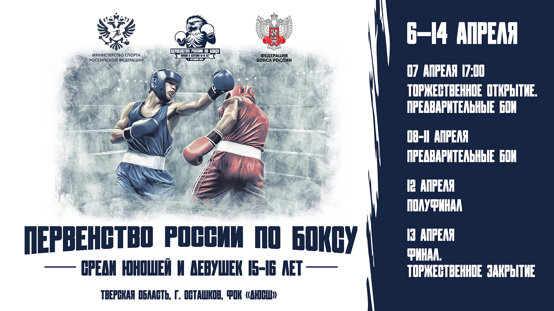 С 7 по 13 апреля в Осташкове (Тверская область) пройдёт Первенство России по боксу среди юношей и девушек (15-16 лет).